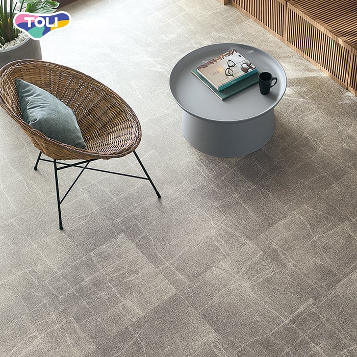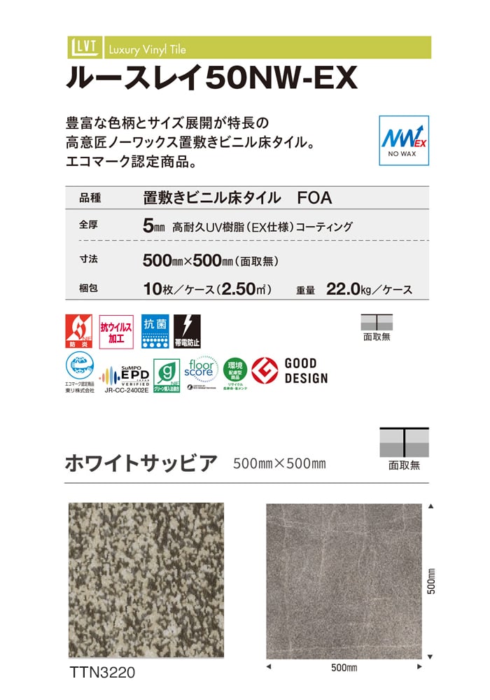 オフィスや店舗、各種施設で幅広く利用できる、ワックスメンテナンス不要の高意匠置敷きビニル床タイル。