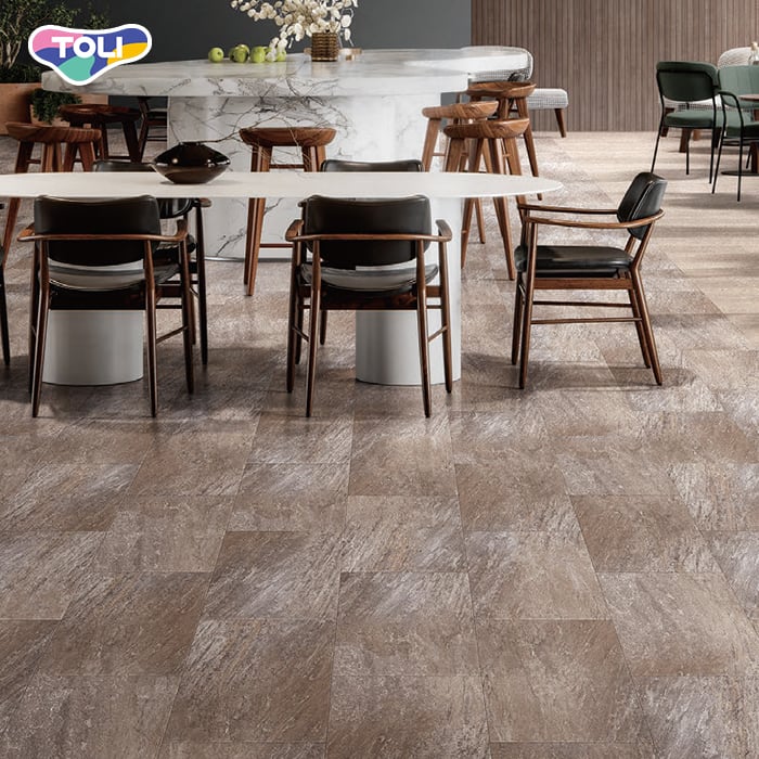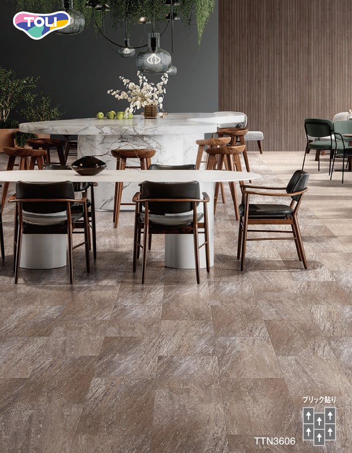 オフィスや店舗、各種施設で幅広く利用できる、ワックスメンテナンス不要の高意匠置敷きビニル床タイル。