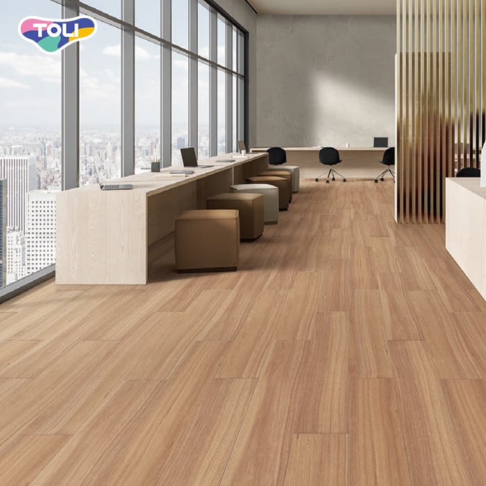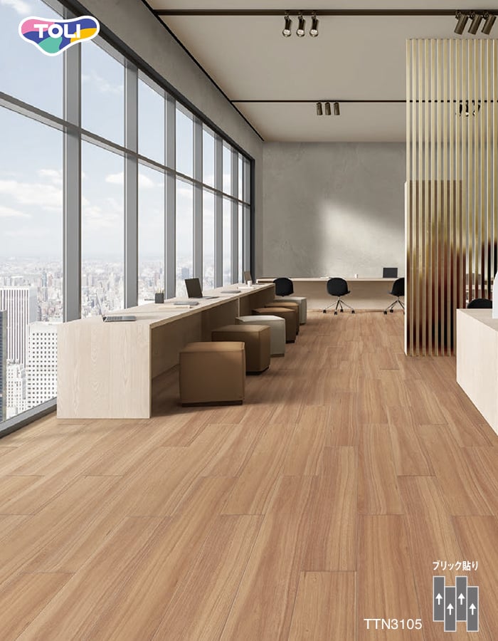 オフィスや店舗、各種施設で幅広く利用できる、ワックスメンテナンス不要の高意匠置敷きビニル床タイル。