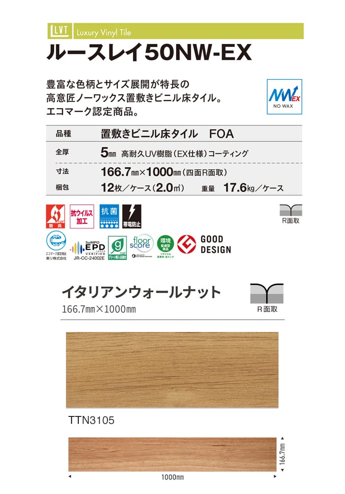 東リ フロアタイル ルースレイタイル50NW-EX TTN3105 全厚5mm 12枚入