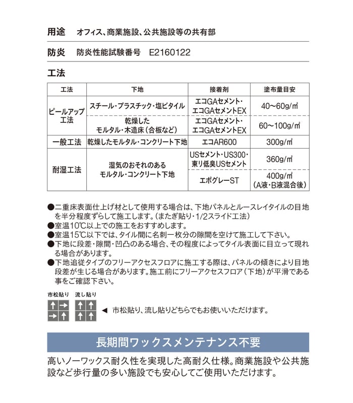 ○NO WAX EX:長期間ワックスメンテナンスが不要な床材です。日常清掃だけで、永く美観を維持できます