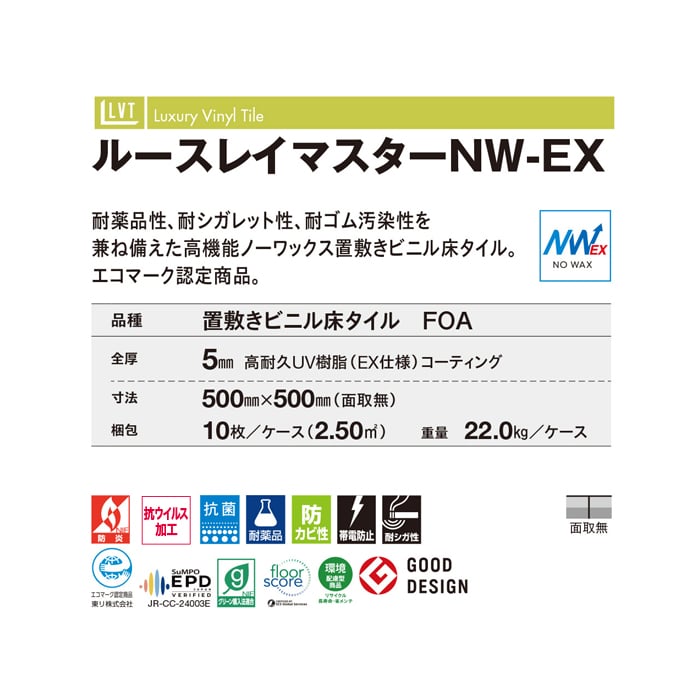 ○NO WAX EX:長期間ワックスメンテナンスが不要な床材です。日常清掃だけで、永く美観を維持できます