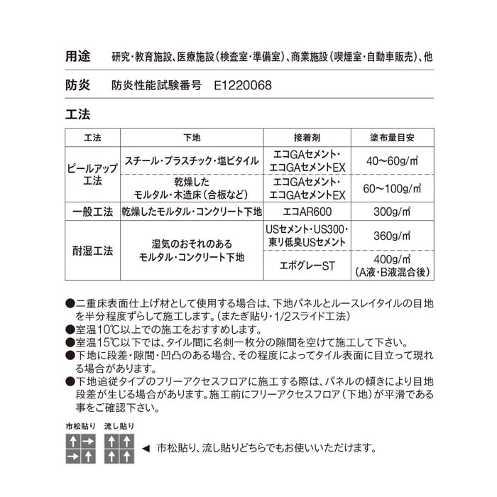 ○帯電防止:静電気を拡散させ、発生を緩和する帯電防止グレード。静電気の発生による障害を防止したい場所への施工におすすめ