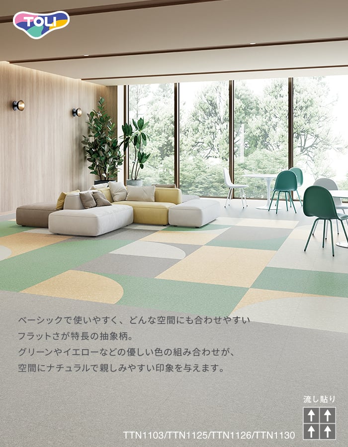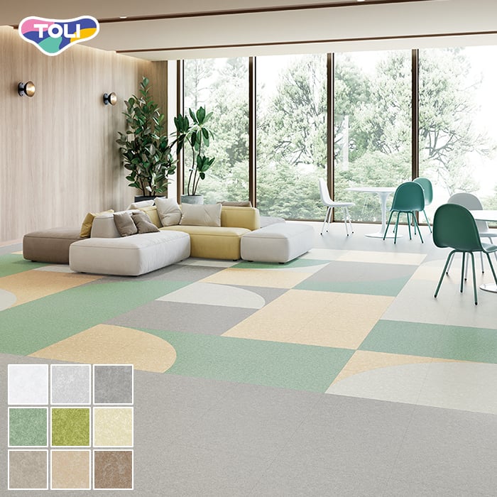 ワックスメンテナンス不要。オフィスや各種施設で幅広く利用できるスタンダ-ド置敷きビニル床タイル。