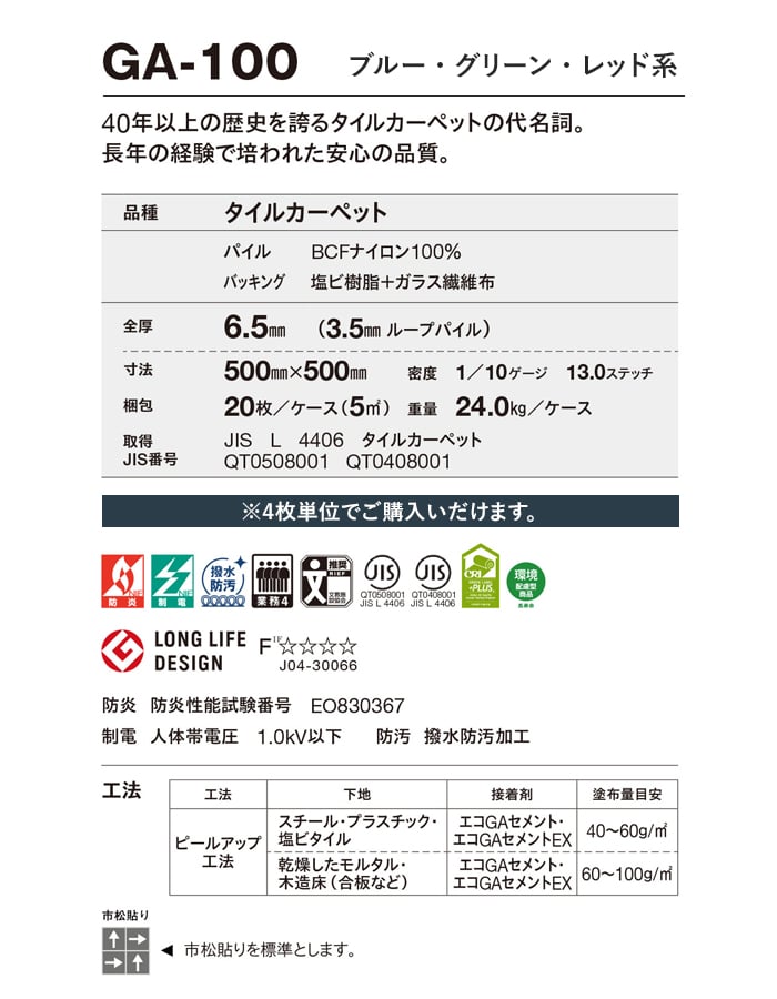 タイルカーペット 50×50 東リ GA-100 ブルー・グリーン・レッド系 4枚単位