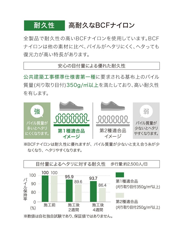 ○歩行 業務4:ロビー、エントランスホール、廊下など、歩行量が多く、また台車などの重量物が頻繁に往来するような部位に適しています。