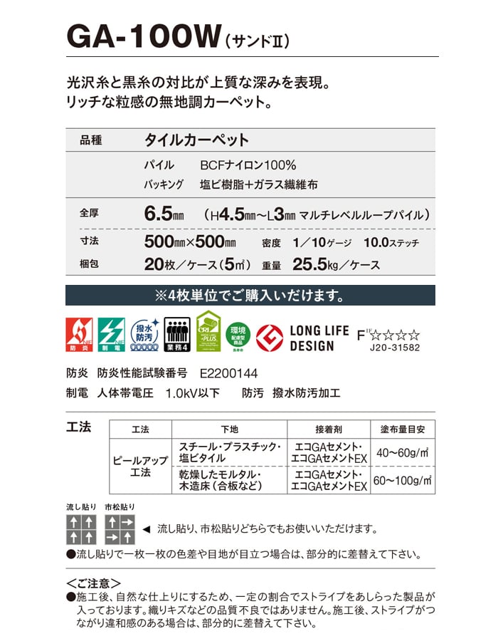 タイルカーペット 50×50 東リ GA-100W サンドII 4枚単位