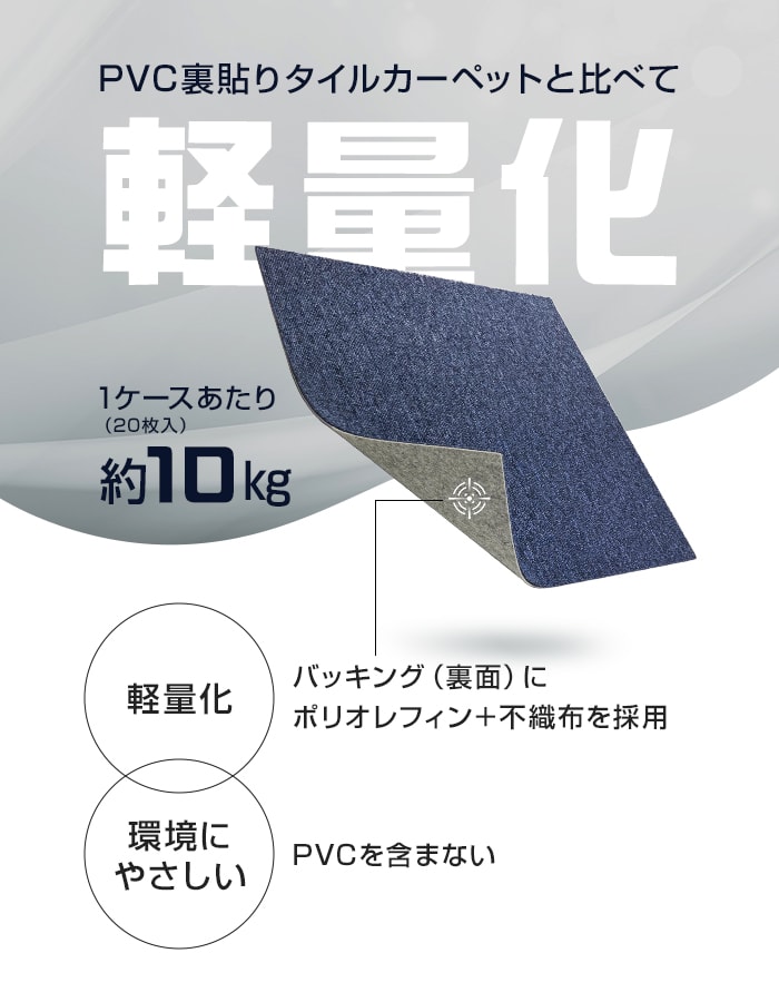 ◆裏面にポリオレフィン+不織布を採用し、従来品と比べて1ケース(20枚入)あたり約10kg軽量化。