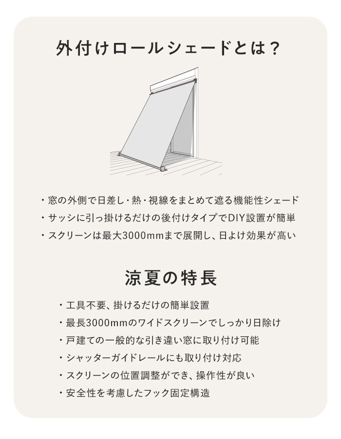窓の外に掛けるだけで、強い日差しをしっかり遮る外付けロールシェードです。