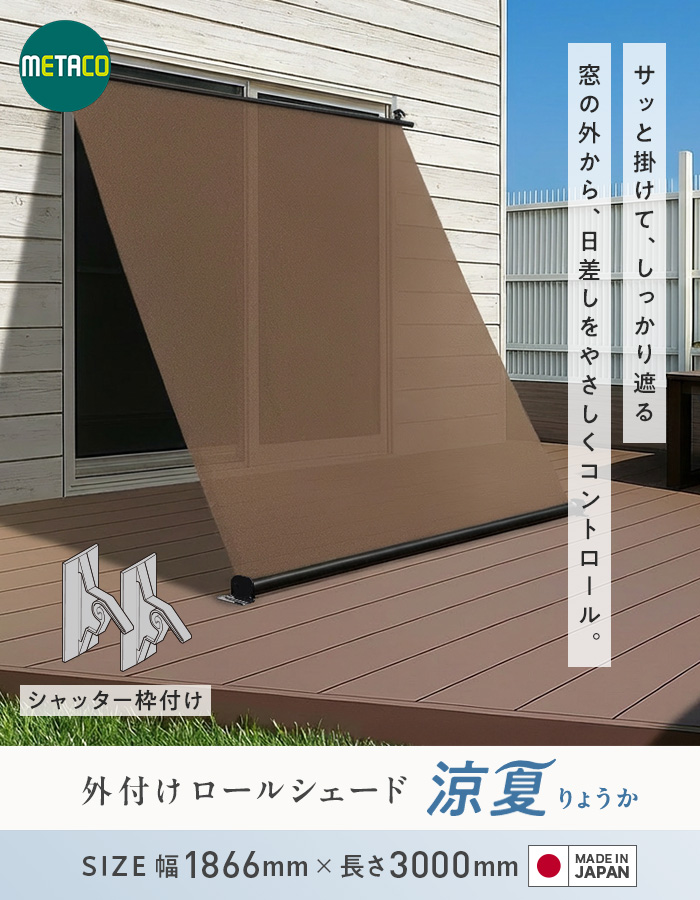 窓の外に掛けるだけで、強い日差しをしっかり遮る外付けロールシェードです。