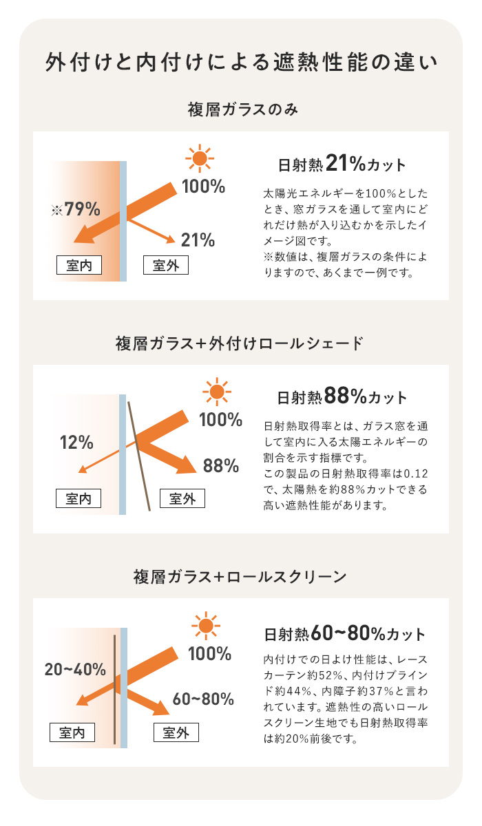 直射日光を外側でカットすることで、室内の温度上昇を抑え、エアコン効率の向上にも役立ちます。