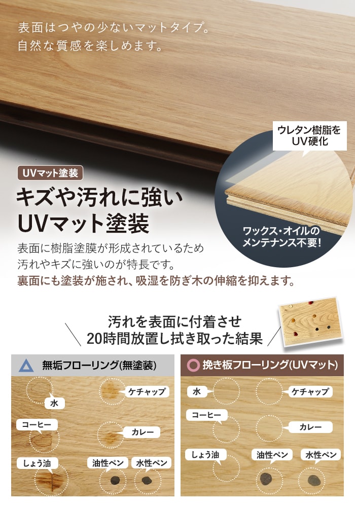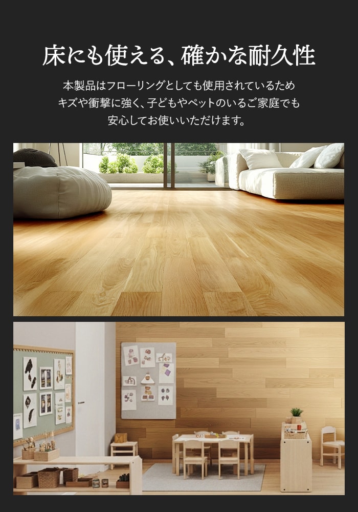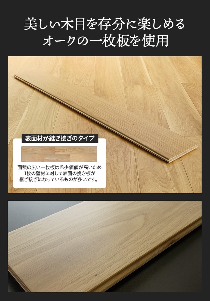 表面材は継ぎ目のない一枚板を使用しているため、オーク特有の美しい木目を存分にお楽しみいただけます。床材にも使用されているほどの優れた耐久性が特長。お子様やペットがいるご家庭にもおすすめです。