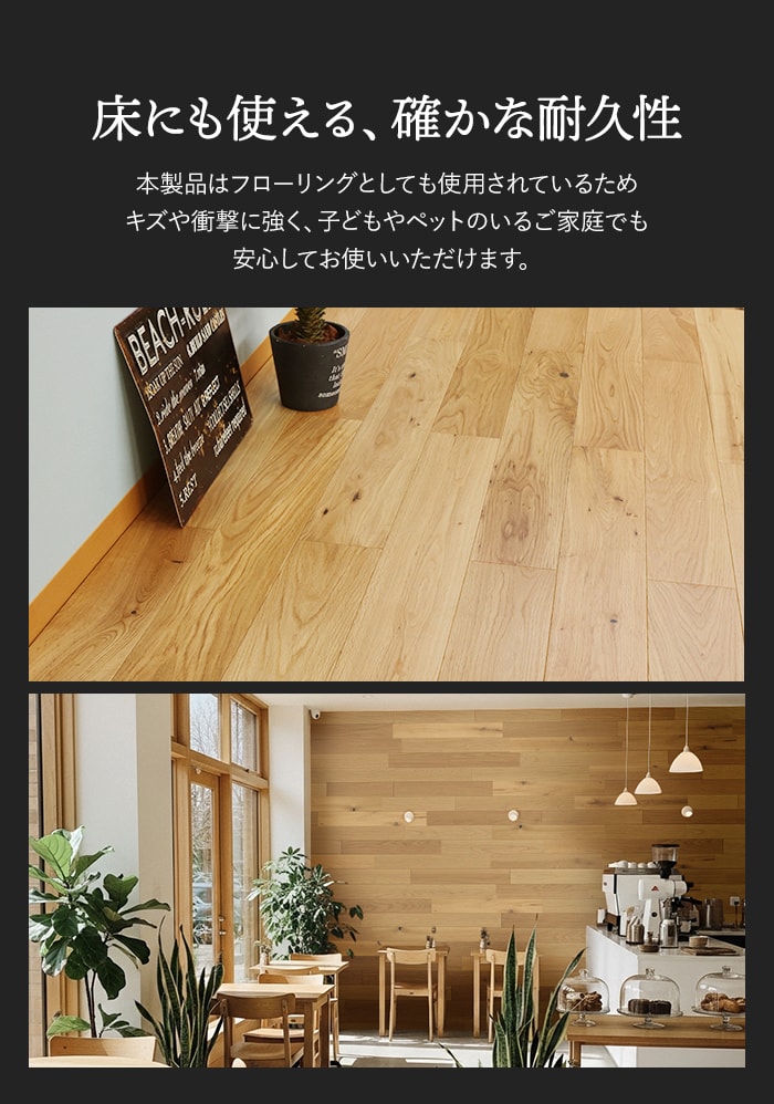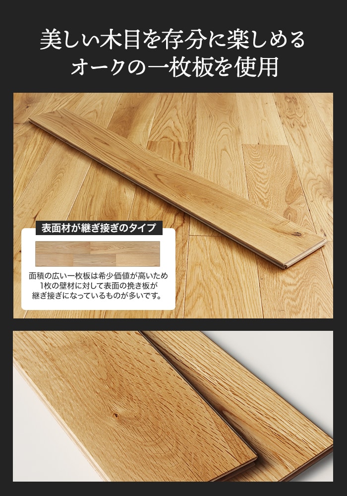 表面材は継ぎ目のない一枚板を使用しているため、オーク特有の美しい木目を存分にお楽しみいただけます。床材にも使用されているほどの優れた耐久性が特長。お子様やペットがいるご家庭にもおすすめです。
