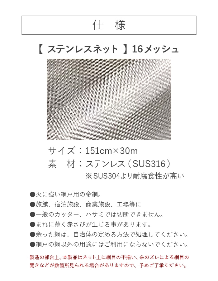 網戸 張り替え用網 ステンレスネット SUS316 16×16メッシュ 151cm×30m