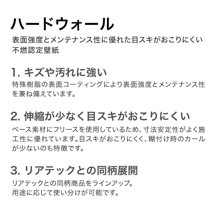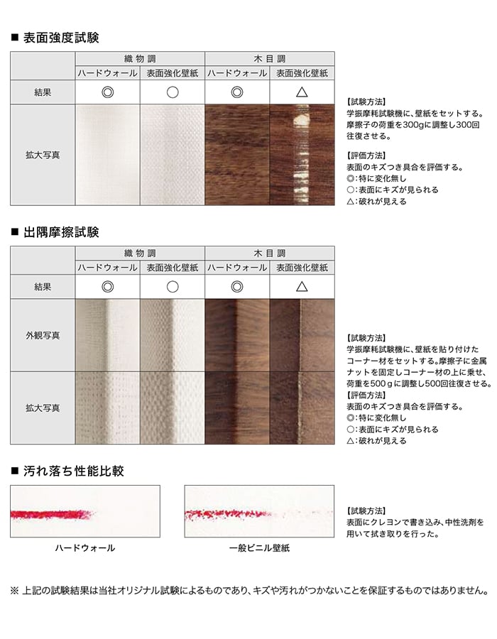 ○表面強化:一般のビニル壁紙に比べ、破れにくく傷つきにくい壁紙です。(表面強化性能4級以上)