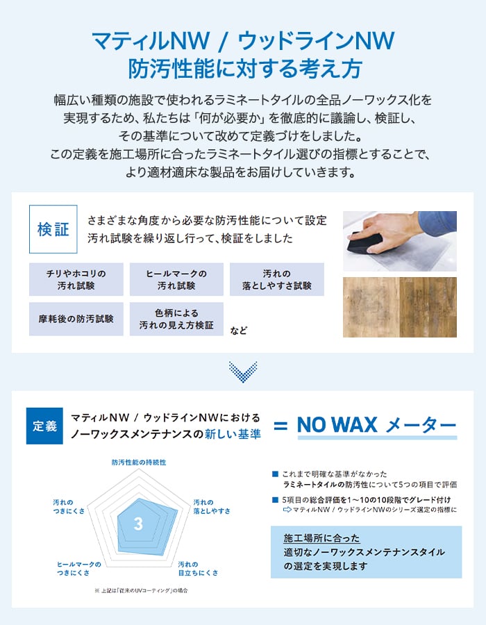 ノーワックス仕様になって、剥離洗浄時の廃液などの環境負荷を低減。