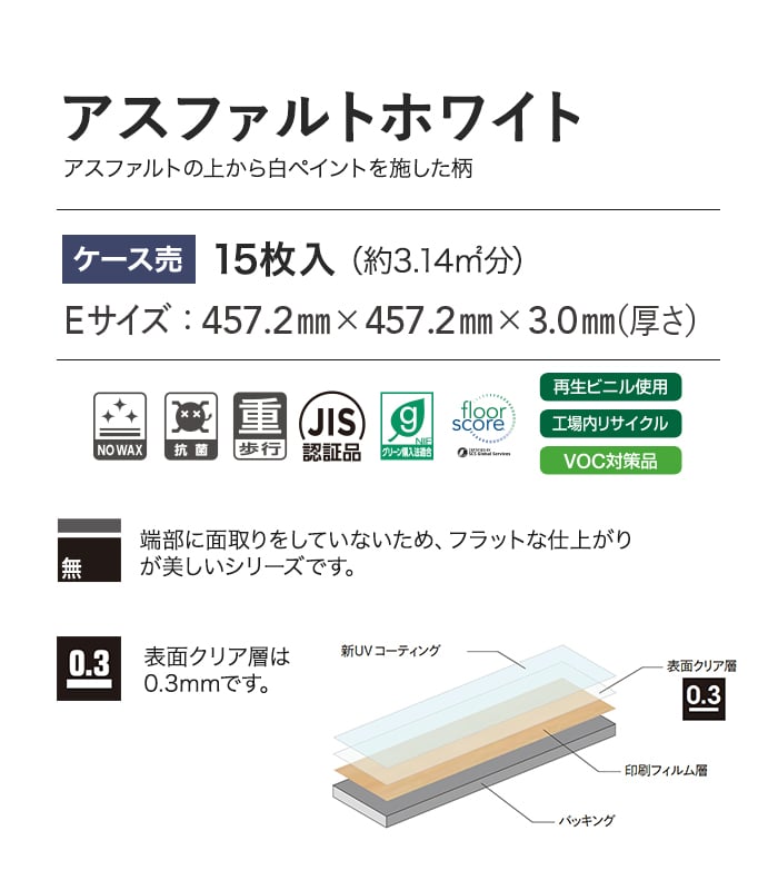 ○重歩行対応:通常仕様品と比べて厚みがあるため、歩行量が多い場所や荷重がかかりやすい場所におすすめです