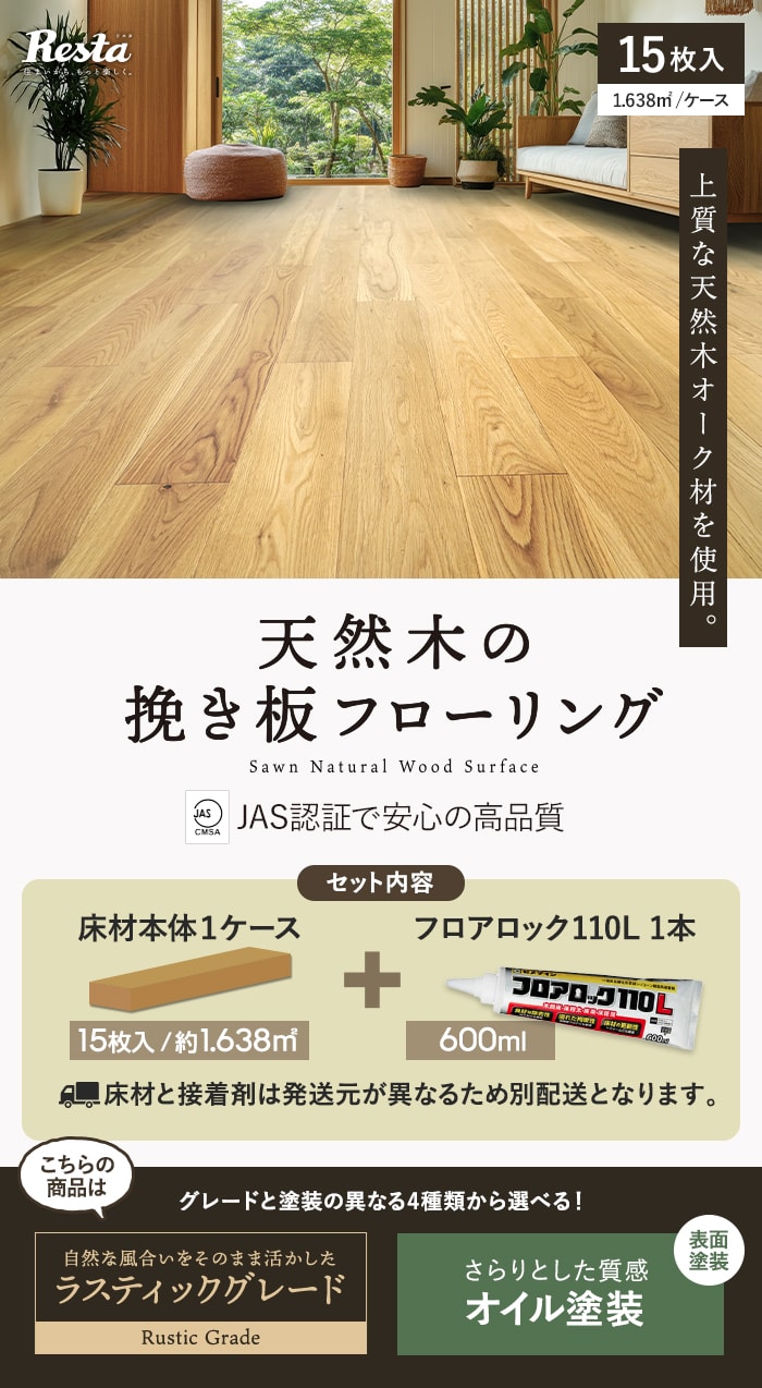 【接着剤セット】フローリング材 挽板 オーク ナラ 12mm厚 ラスティックグレード オイル塗装 15枚入