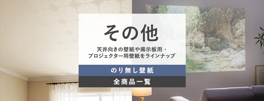 天井施工に適した軽量タイプや、掲示板クロス、プロジェクター用壁紙など、特殊な用途に対応する「その他ののり付き壁紙」。一般的なビニールクロス以外の素材や機能を持つ商品をラインナップしています。場所や目的に特化した壁紙をお探しの方はこちらから。