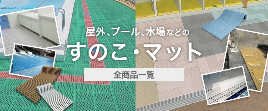 プールサイドや更衣室、シャワー周りなど水がかかる場所に最適なすのこ・マットの一覧ページです。滑りにくく安全な歩行環境をつくる水まわり専用マットをラインナップ。プールサイド・シャワー室・通路など用途に合わせて選べ、学校プールやスポーツ施設、温浴施設など幅広い施設で活躍します。軽量で扱いやすく並べるだけで簡単に施工でき、メンテナンスや清掃のしやすさも特長です。