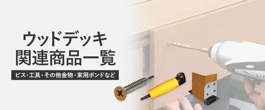 ウッドデッキ用のビス(ネジ)、工具、その他金物、束用ボンドまで目的に合わせて選べるラインナップ。