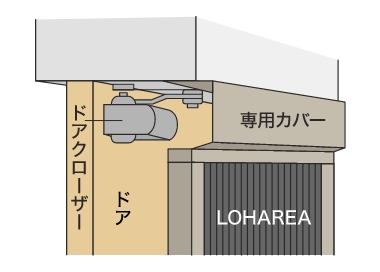 ロハリアはドアクローザー(扉がゆっくり閉まるようにするための装置)がついている勝手口にも対応しています。ドアクローザーが干渉して通常のタイプが取付けできない場合は、専用カバー付きのドアクローザー対応タイプをお選びください。
