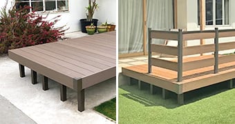 ABS樹脂を使用した3層構造&耐候性抜群のプラスッド材(床板・幕板)と、樹脂束マルチポスト、アルミ根太を使って丈夫なウッドデッキDIYが可能です。