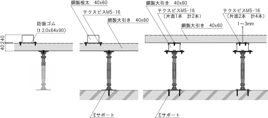 鋼製大引きと鋼製根太の固定は、テクスビスM5-16を片面1本×両面の計2本で固定します。鋼製根太のジョイント部の場合は、テクスビスM5-16を片面2本×両面の計4本で固定します。鋼製根太のジョイント部は、Eサポートの中央部で、クリアランス1~3mmを確保してください。公共性の高い場所で使用する場合は、大引きと根太のクロス部分に防振ゴムを設置してください。