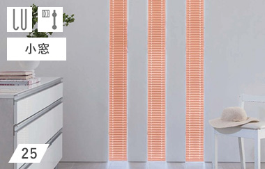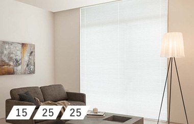 スタンダードなスラットの幅が25mmのタイプです。どんな窓にでも合うバランスの良い幅で、一番上までブラインドを操作したときのたたみ代た15mm幅と比べて小さくなります。