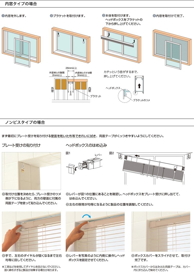 取付け作業の前に、ヘッドボックスを手でつかめるようにするため、ヘッドボックスとスラットの間に指が通る程度(10cm程度)スラットを下げておいてください。