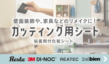 家具やドアのリメイク・壁面装飾など、様々な場所・用途で使われるカッティングシートの一般名称は「粘着剤付き化粧フィルム」といい、RESTAでは総称して「カッティング用シート」と呼んでいます。この他に、リメイクシート、化粧シートなどと呼ばれることもあります。