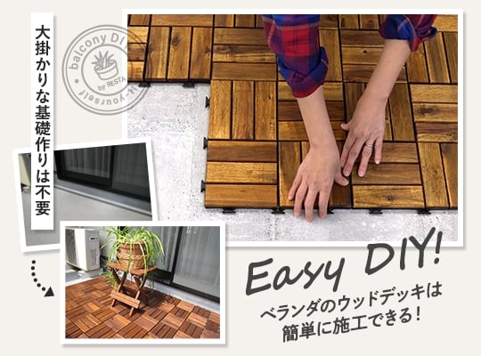 マンション・戸建て住宅のベランダをウッドデッキの空間にしたい!という方も多いと思います。そんな場合はベランダに最適なデッキタイルが1番おすすめ!ジョイント式のパネルをベランダに敷き詰めていくだけなので簡単に設置できます。ベランダ・バルコニーをもっとオシャレに有効活用できますよ!