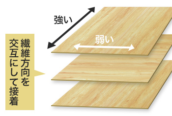 木材は、繊維方向に対する力には強く、繊維と垂直の方向の力には弱い性質があります。合板は繊維の方向を交互にして接着しているため、強度が均等になるのがメリットです。木材には、強度の高いラワンと呼ばれる東南アジアを中心に分布する木材が使用されることが多いです。