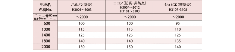 ニチベイハニカムスクリーン商品仕様(標準タイプ たたみ代の目安)