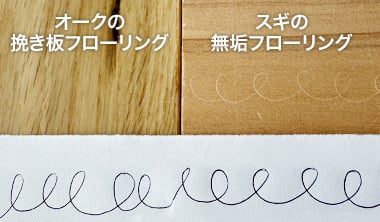 フローリングの上に紙を置き、ボールペンで線を書いたところ、UV塗装されたオークの挽き板フローリングにはキズは付きませんでした。一方で、無塗装のスギ無垢フローリングには、ボールペンの筆圧による跡がくっきりと残ってしまいました。