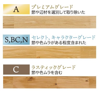 節やミネラルステインの有無、辺材の混入の程度によってランク付けがされます。節や辺材を選別して取り除いたグレードをA(プレミアムグレード)、節や色ムラがある程度含まれたグレードをS,BC,N(セレクト、キャラクターグレード)、節や色ムラを含むグレードをC(ラスティックグレード)と呼びます。