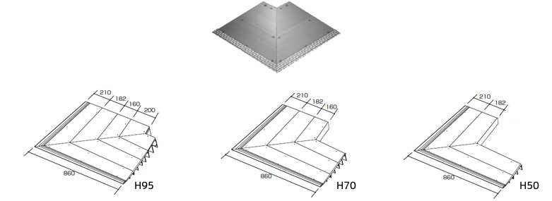 スロープ部にコーナー(入隅・出隅)が出来る場合に使用します。 サイド部分にカバーが必要な場合は、別売りのSEスロープキャップをお求めください。 (H50 ・H70 ・H95それぞれに左右用があります。)