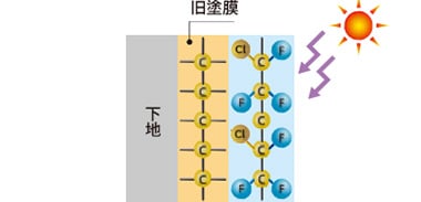 キクスイ SPパワーフッ素クリヤーを旧塗膜の上に塗装することにより、旧塗膜への紫外線の影響を抑えることができます。一般的なクリアー塗装では透過してしまう紫外線を効率よくカット。可視光は透過するため、旧塗膜の色を残したまま高い保護機能を加えることができます。