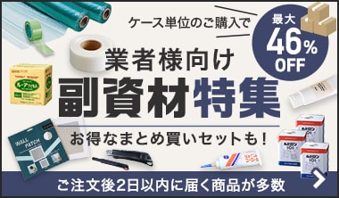 業者様向けに、壁紙の補修材や下地処理材、施工道具などの副資材をピックアップ!ファイバーテープやリペアプレートなど、頻繁に使用する消耗品はケース単位で購入できるセット品もあり、単品での購入より最大46%OFFと断然お得になっています!