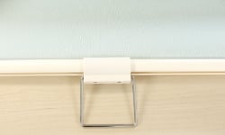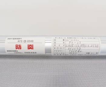 防炎ラベルと製造番号等の商品情報は、ローラパイプの中央に貼り付けてあります。確認が必要な場合は、スクリーンをローラーパイプが見えるまで下にさげてください。