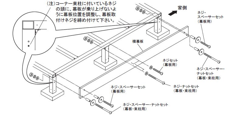 - 横幕板×1・ネジセット(幕板用)×2・ネジ・ナットセット(幕板・束柱用)×2