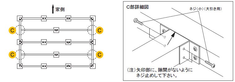 コーナー部(B部)4カ所に、コーナー束柱をネジ(小)(大引き用)で組み付けて下さい。