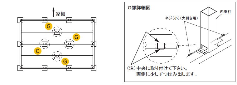内束柱をネジ(小)(大引き用)で、G部に組み付けて下さい。