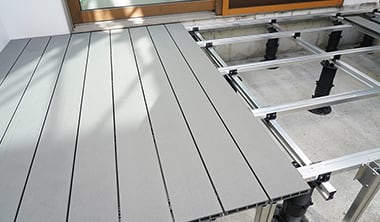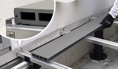基礎部材THILFEをクロス工法で設置し、その上に人工木デッキ材RESIN WOOD2を施工します。 -