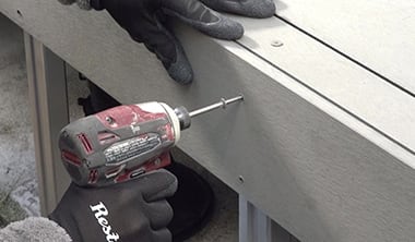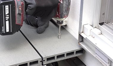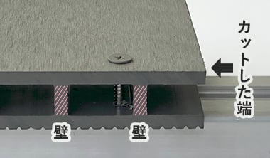 床板の端(長手方向)をカットした場合は、脳天ビス止めで固定します。ビスの直径より1~2mm大きい下穴をあけて、床板に合わせたカラーの専用ビスで止め、最後は手締めで固定します。