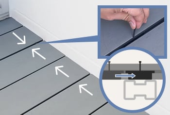 固定クリップは、ビスで根太の位置にスライドできます。はめ込んだ後は、詰まっていた間隔を戻してクリップを固定すればOK!